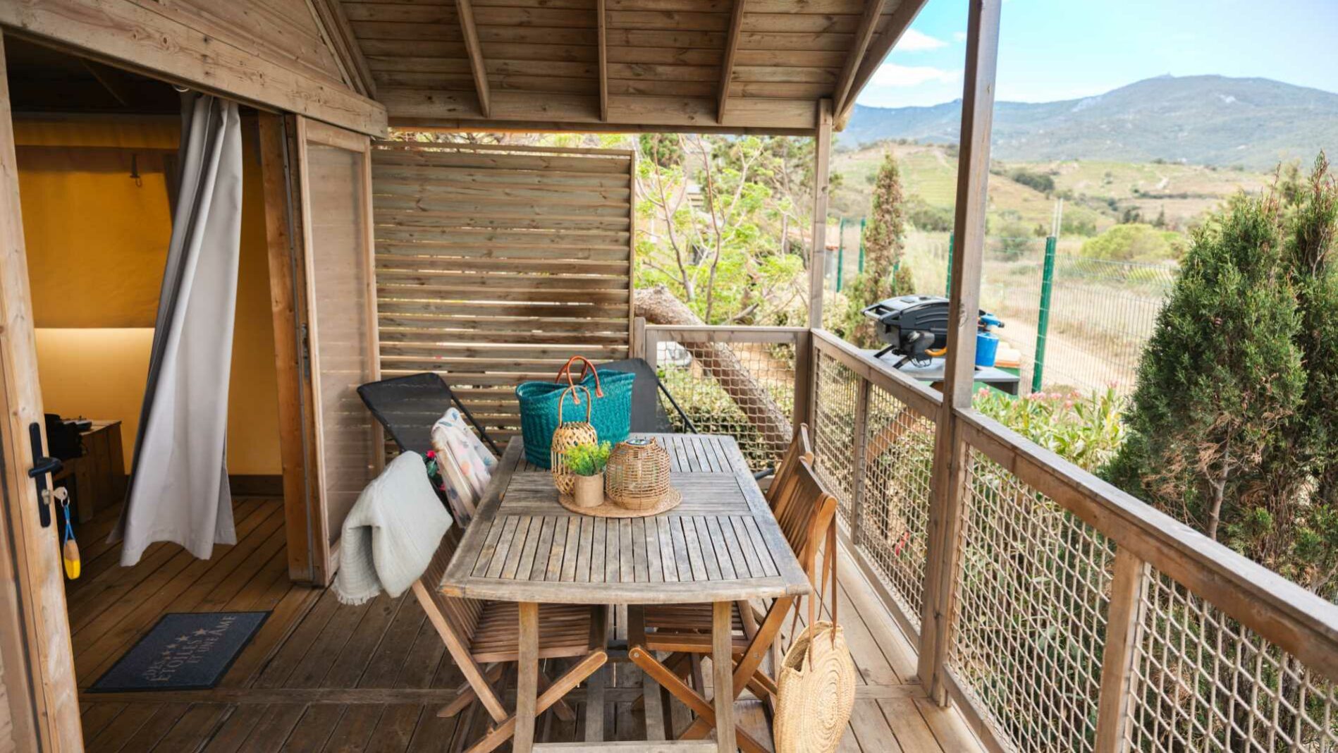 24 m² + 10 m² Of covered terrace. One bedroom with 1 double bed (140×190), one bedroom with 2 single beds (80×190), one sofa bed for 2 people (140×190). A fully equipped kitchen. Wooden garden furniture.
