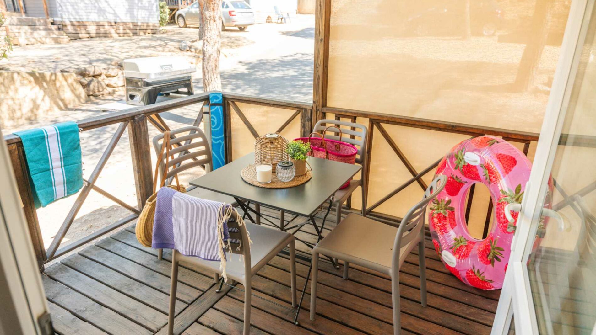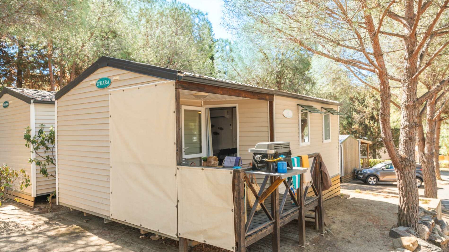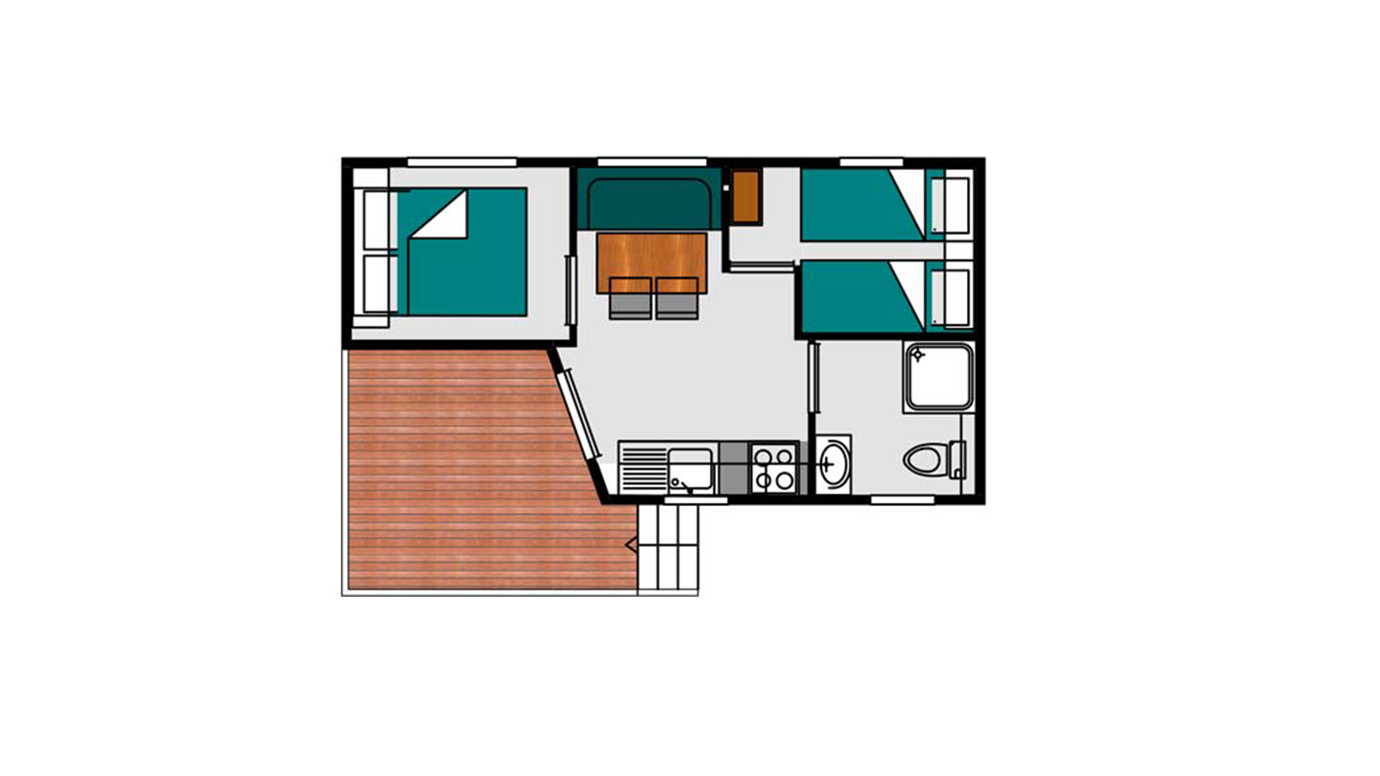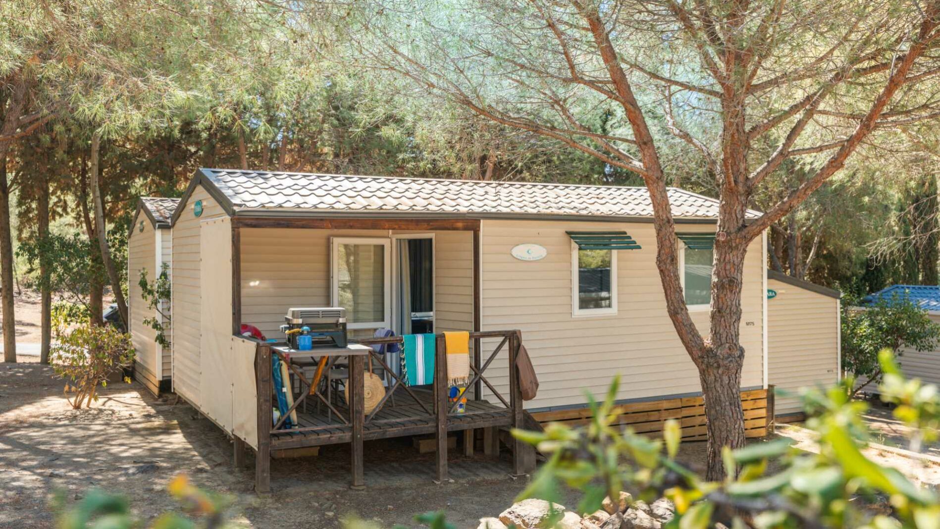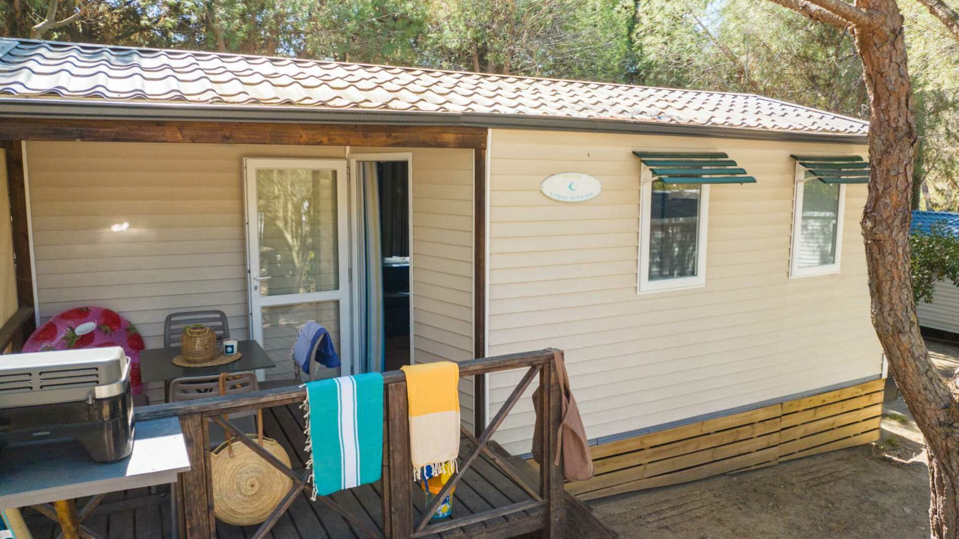 20 m² + 7 m² Of covered terrace, 1 double bedroom (160 x 200), one bedroom with 2 single beds (80 x 190). A dining area convertible into bed for 2 people (140 x 190), a fully equipped kitchen, 1 bathroom with shower, toilet and sink. Garden furniture.